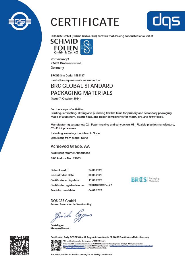 As a manufacturer of primary packaging for the food industry, we are conscious of this vital aspect and are vigilant about a consistently high level of quality as well as precise adherence to all hygiene standards.